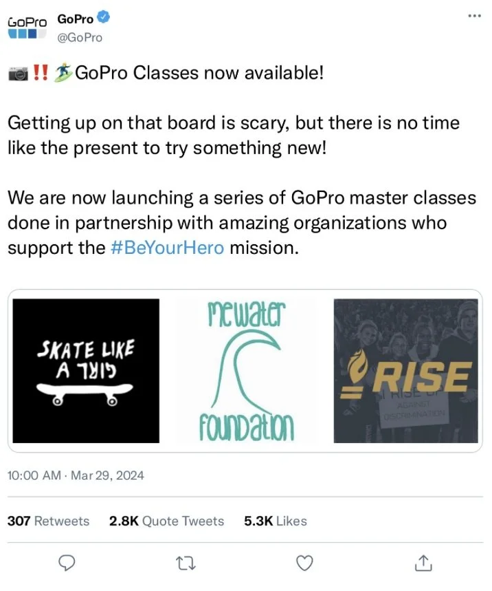 Go Pro launches a series of classes in partnership with organizations such as Skate Like A Girl, MeWater Foundation, and Rise. All organizations looking to empower youth and create safe and healthy environments of athletic growth.